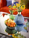 Blå vas ”Akaleja”, 379 kr, Ellos. Grön vas ”Iris”, 1 800 kr, grön skål ”Hortus Jardinjär”, 1 600 kr, båda från Svenskt Tenn. Foto: Karl Anderson