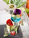 Hög förvaringsbox i polerad mässing/nickel, 3 490 kr, Mustasch i mässing för placeringskort, 990 kr/4 st, båda från Jonathan Adler/inside-too.no. Foto: Karl Anderson