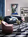 Dova pasteller, sammet, mässing och grafiska mönster skapar en lyxig känsla av uppdaterad art déco. Textilier mot väggen blir ett följsamt element i inredningen och självklart med rosa väggar som bas.