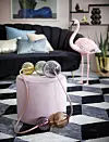 Gardin ”Elvira”, från 1 499 kr, Ellos. Golvlampa ”Grenverk”, h 178 cm, 10 250 kr, Konsthantverk. Stol, 2 999 kr, Sofa Company. Kudde 40x40 cm, 349 kr, Mio. Tavla av Leandro Feal ”What time is it over there? – Bulbs”, 60x80 cm, 2 900 kr, absolutart.com. Bord med marmorbas ”Knock Out Round”, 15 625 kr, Friends & Founders. Vas, 3 800 kr, Svenskt Tenn. Flamingo, 298 kr, Coctail. Väggfärg ”Balett” från Alcro. Foto: Karl Anderson