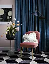 Dova pasteller, sammet, mässing och grafiska mönster skapar en lyxig känsla av uppdaterad art déco. Textilier mot väggen blir ett följsamt element i inredningen och självklart med rosa väggar som bas. Foto: Karl Anderson