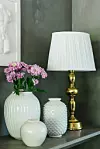 – Jag gillar att hålla på med kontraster, att blanda högt och lågt. Därför har jag tagit hit mina mer moderna möbler, lampor och egna loppisfynd. Några lite kitschiga saker.