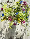 Sju sorters blommor gifter sig fint med de för- ädlade sorterna i rabatten. Blåklint, vildmorot, tistel, pipört, grekisk vädd, daggkåpa, praktlysing och perenn riddarsporre. Kråkvicker ger skönt häng, och gräs från ängen blir en uppstickare i buketten.