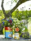 Det finns plats för alla blommor i konservburkar i tre storlekar, från liten käringtand till hög timotej. Rosen är blickfånget i den låga buketten, med skogsklematis som hänger fritt och timotej som strävar uppåt. Den högra buketten bygger på vajande timotej och spenslig grekisk vädd. Den maffiga buketten till vänster bygger på kontraster.