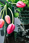 Inredningen är inspirerad av en internationell stil med kuddar, plädar som lysande smycken i färger som korall och babyrosa och stora vaser med buketter i klara färger. Iréne, som är inredningsintresserad, har verkligen lagt ner sin själ i att skapa ett hem som är både sparsmakat och välkomnande. Hon har valt textilier i vackra dämpade toner, medan materialen i snickerier, skåp och möbler är perfekt skräddade till vindsvåningens speciella karaktär. Det märks att hon vet vad hon vill och att hon har styrt valet av inredningen med säker hand. Men så har hon ju redan tre vindsbyggen med sig i bagaget.