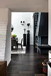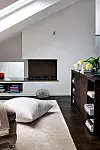 Snedtaket i kombination med den öppna spisen ger en intim atmosfär i den stora lägenheten. Lampa ”Kluster” från Tadé.