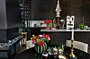 En sovavdelning har skapats i ett etage över vardagsrummet. En trappa som ser ut att sväva i luften leder upp till övervåningen, här finns sovrum, bad och walk in closet. Köket med köksö platsbyggdes i ett mörkt träslag av snickeri-firman Lappvattnet. En öppen spis murades och markerar övergång mellan matsal och kök. Den har gaslågor runt om och går att tända i sektioner. Den höga spektakulära spiskåpan som är klädd helt i skuren svart plåt ger en känsla av konstinstallation med sin enkla form.