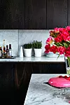 Köksön har en skiva i cararramarmor som fasats in nedåt för att skapa en illusion av att den är supertunn och nästan svävande.