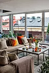 Den stora soffgruppen vänder sig mot våningens gatsida som har en kungsbalkong längs hela sidan. Väggen som revs ersattes med glasade skjutdörrar för att ge maximalt ljusinsläpp. Soffor, Minotti/Ekerö Möbler, gardiner, Silent Gliss/Wave, italiensk golvlampa, Posh Living. Kuddar i sammet från Bohème, prickigt tryck, Walles & Walles, kashmirpläd i pepitamönster från Interior Plus. Utemöbler från Andreu World, krukor och plantor, Ulriksdals Slottsträdgård.