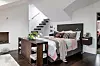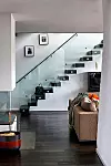 Trappan som ser ut att sväva i luften leder upp till övre etaget med sov­avdelning. Genomgående är de mörkbetsade ekgolv som binder ihop hela våningen och ger ett varmt och mjukt intryck. Vedkorg från Eldvarm, soffa, Minotti.