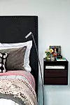 Golvlampan vid sängen kommer från Norrmalms El, nattduksbord, Montana, brynja i kashmir från Interior Plus.