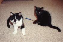 Det blev två kissar. Dels för att de var ursöta, dels för att hon tänkte att de nog kunde få väldigt kul ihop. Hon valde svarta Ville, med en enda liten vit fläck på kroppen, och Viktor, svart med vita tassar och ett mönster i ansiktet som var helt omöjligt att motstå. |