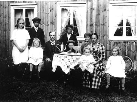 Irma i sitt barndomshem tillsammans med äldre syskon och föräldrar. Fr v Vivi, Roland, Gullan, pappan, Arvid, Assar, Thorsten, mamman med Irma i knäet, och Sonja.