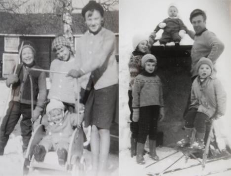Stina och Ylva växte upp i finska Österbotten. Här syns de med sina syskon samt mamma Gertrud (på bilden till vänster) och pappa Karl (på bilden till höger).