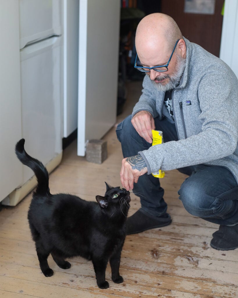 Anders har två svarta katter som tittar nyfiket fram, inne i hans lägenhet i Majorna, i Göteborg.