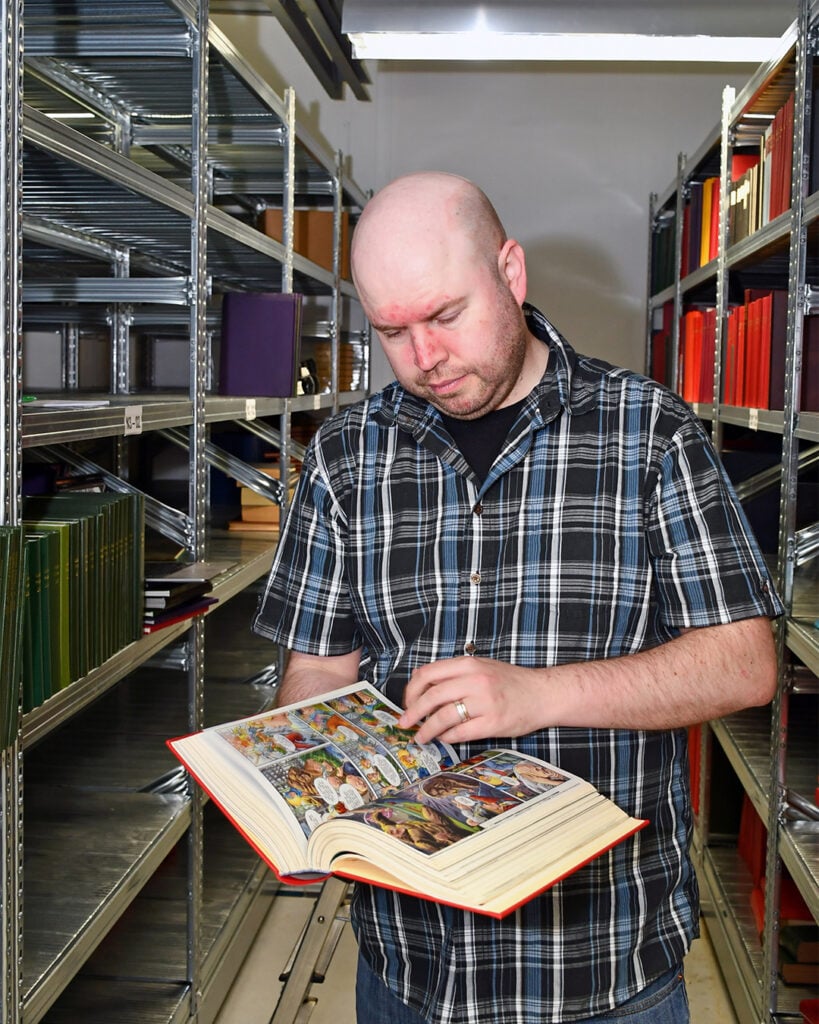 – Men allvarligt talat. Jag är på arkivet för att försöka ta reda på vem som skrivit manus till olika avsnitt under serietidningens första 30 år. Fram till omkring mitten av 70-talet sågs serietidningar som skräplitteratur och ofta hände det att manusförfattare eller andra som medverkade i tidningen inte hade med sina namn.