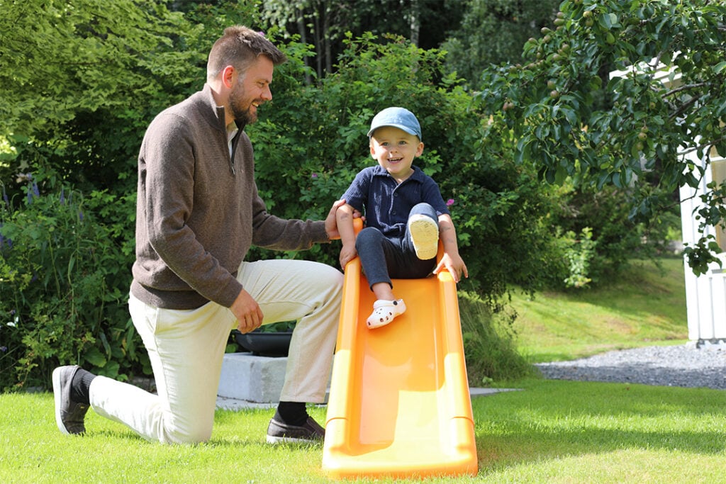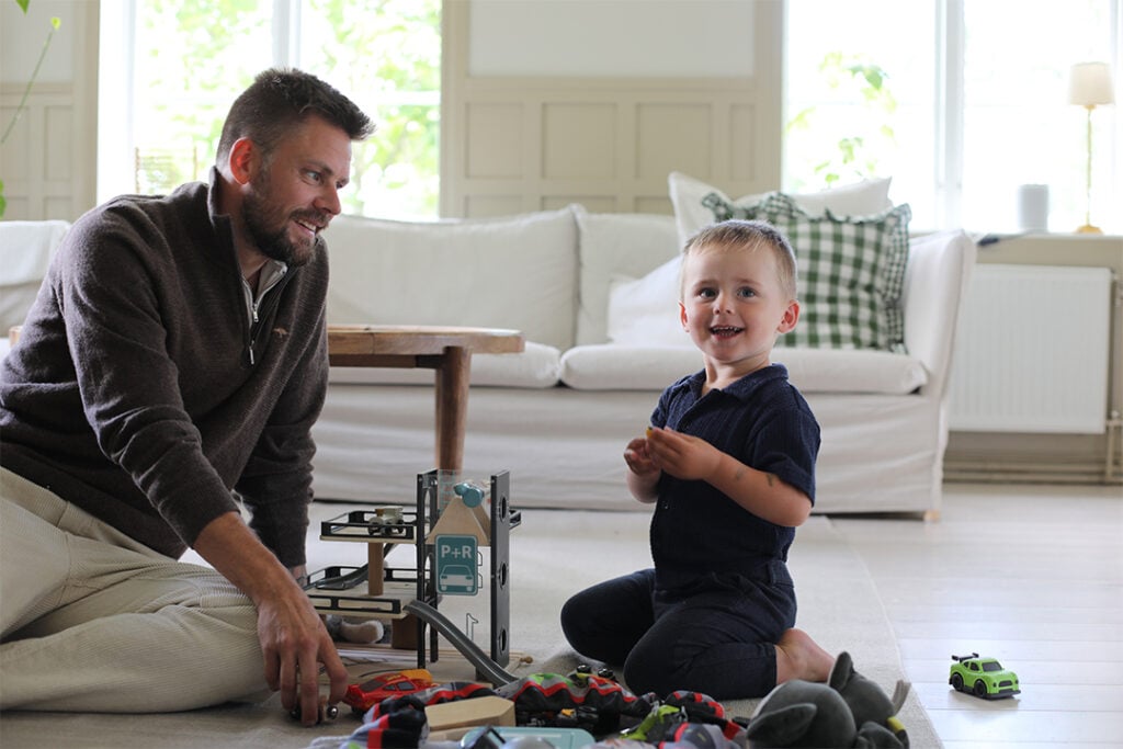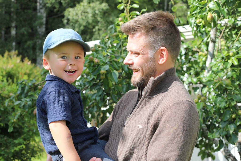 Hemma i huset i Örnsköldsvik är det full rulle. Malte, 2 år, kommer springande och visar att han vill leka med pappa Jonatan. Han drar upp pappa från soffan och de sätter sig på golvet för att leka med bilar.