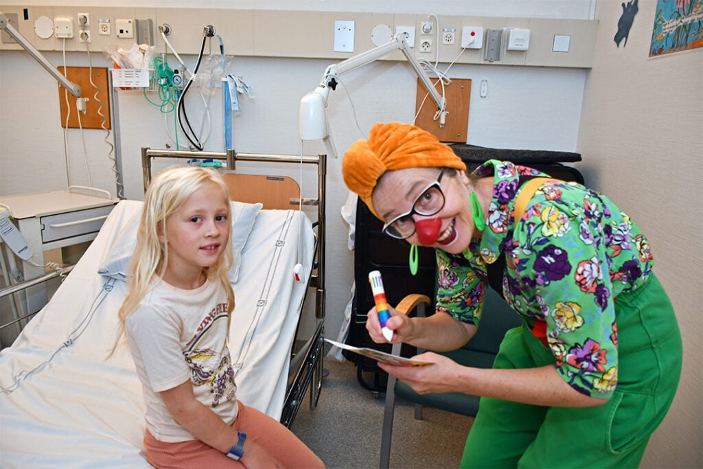 En av dem de träffar den här dagen är Hedvig Lindström, 7 år, som vårdats på avdelningen i två veckor för en brännskada. Trots att hon äntligen ska få åka hem med sin mamma ser hon lite nedstämd ut.