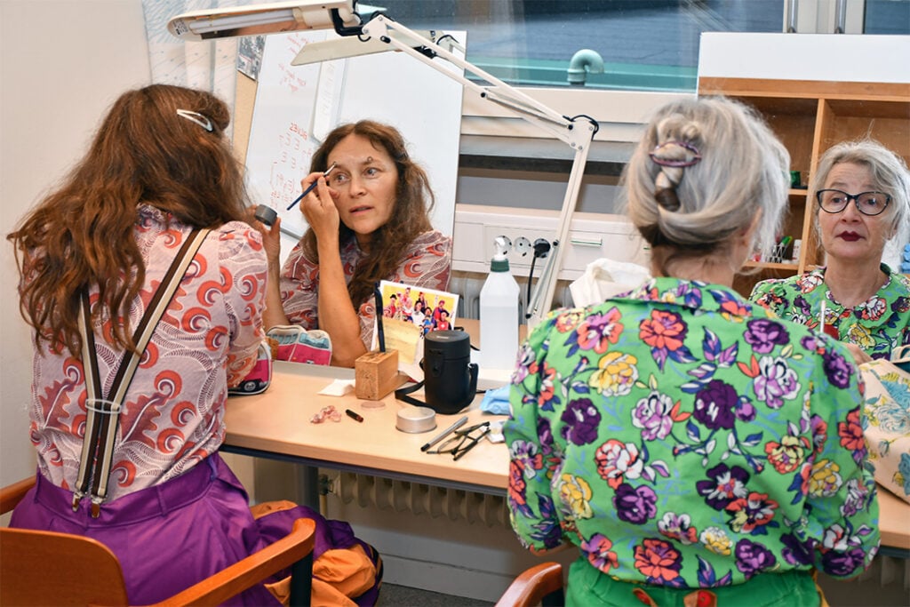 Den här fredagen, när Hemmets Journal följer med dem under ett arbetspass, börjar dagen med att de byter om och sminkar sig i det speciella rum som sjukhusclownerna disponerar på barnkliniken.