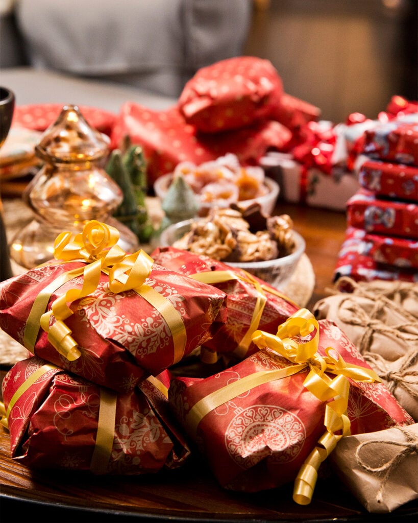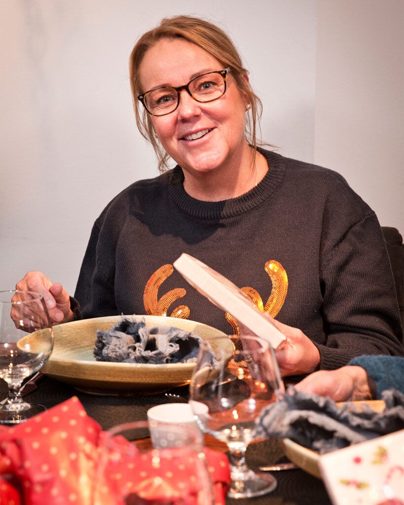 Till traditionen med julklappsutdelningen är att pakten ska öppnas under bordet och att mottagaren ska gissa innehållet. Förutom de gröna skålarna från Höganäs innehöll paketen hemma hos Carola bland annat tomtar, servetter, tigerbalsam och en bricka.