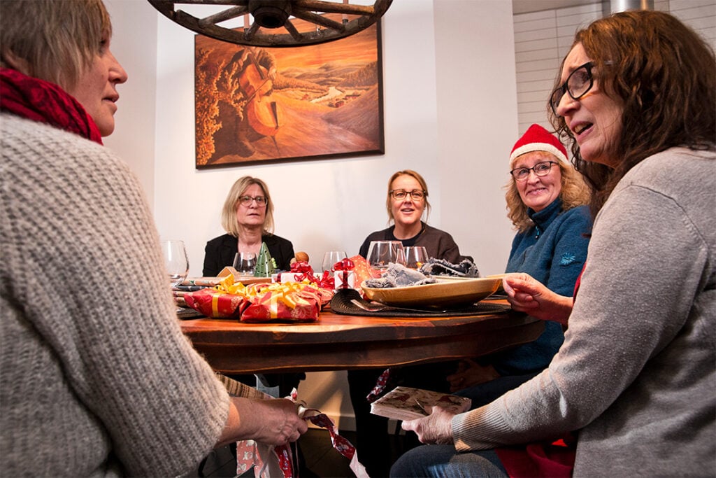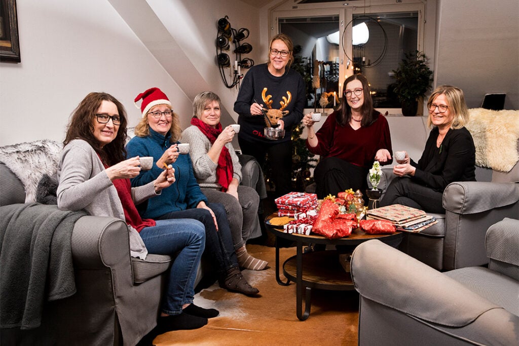 Vi är på den traditionella julfesten med barndomsvännerna från Forshaga i Värmland. Runt bordet sitter Carola Kyrk, Cissi Leibring, Susanne Persdotter, Maria Wallström, Anna Sandqvist och Susanne Nordh.