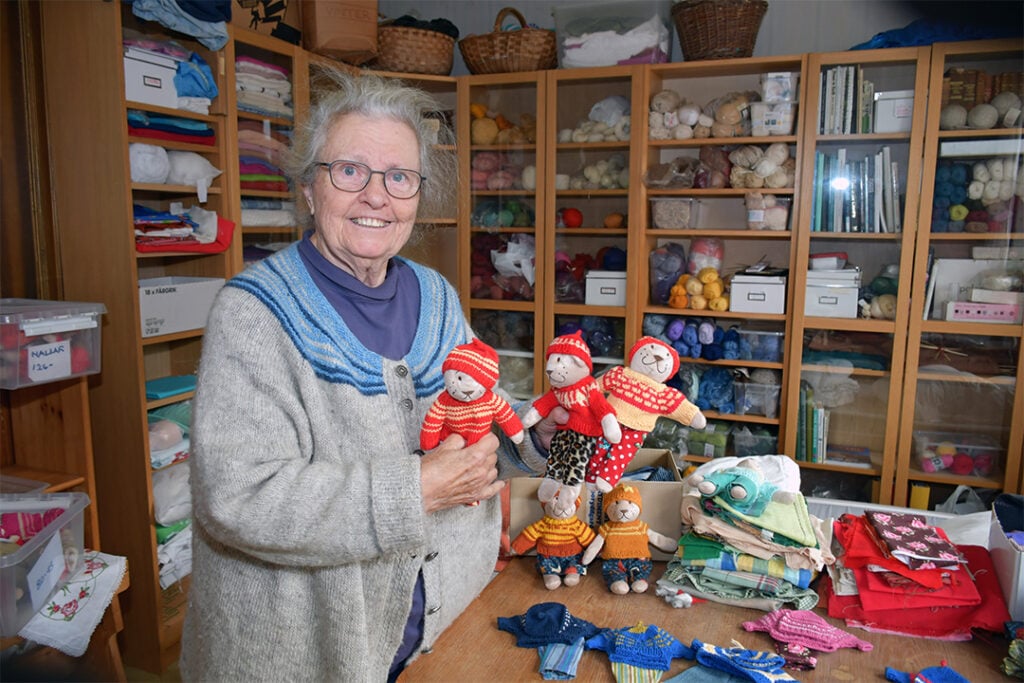 Sedan ett par år syr, stickar och virkar Kajsa Hylmö, 82, kläder åt små nallar som hon skickar med Ukrainahjälpen till det krigsdrabbade landet.