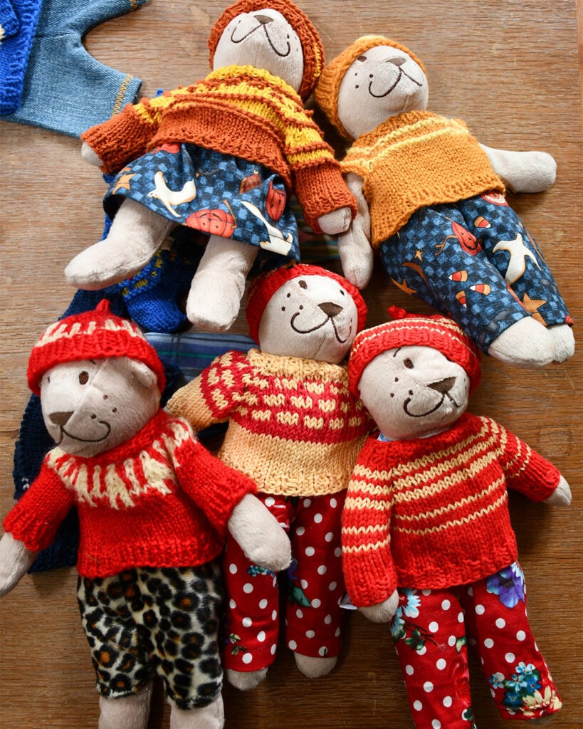 Kajsa köpte in ett stort parti nallar och sydde sedan byxor åt dem av stuvbitar hon hade hemma. Av restgarner stickade och virkade hon tröjor och mössor.