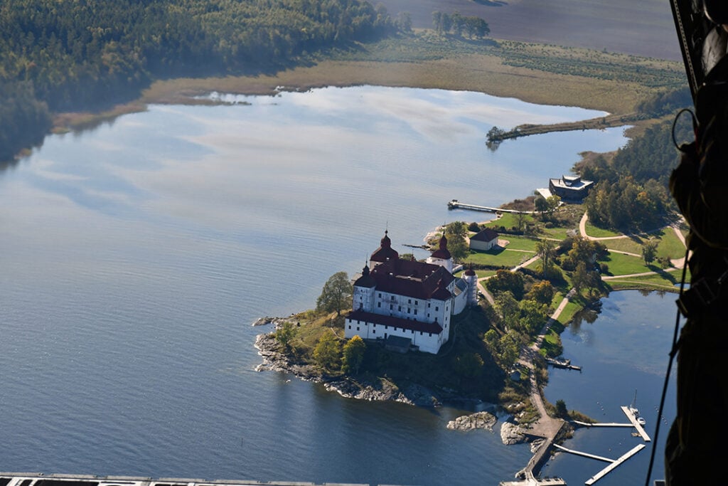 Så fort vi efter starten kommit upp på några hundra meters höjd får vi ta av oss säkerhetsbältena. Lastmästarna öppnar lastluckan i transportflygvapnets akter och det västgötska landskapet och Vänerns södra strand breder ut sig under oss.