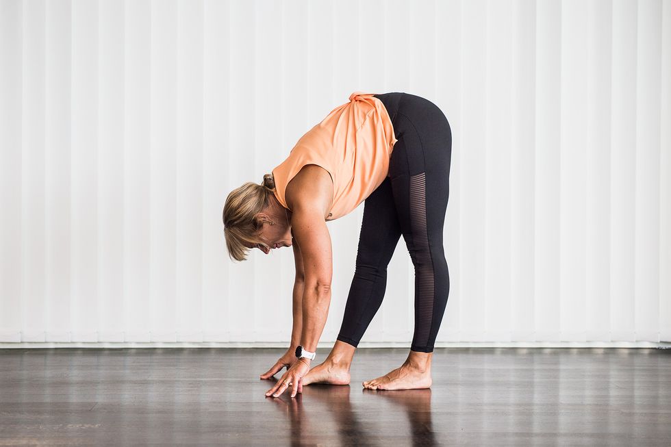 Stå med raka ben och fäll fram överkroppen. Vandra framåt fem–sex steg med raka ben samtidigt som du lutar dig fram så mycket som möjligt och “duttar” med fingrarna mot golvet, ända ner om du kan, så att du får en gungande rörelse. Vänd och gå tillbaka. Gör rörelsen fyra–fem gånger.