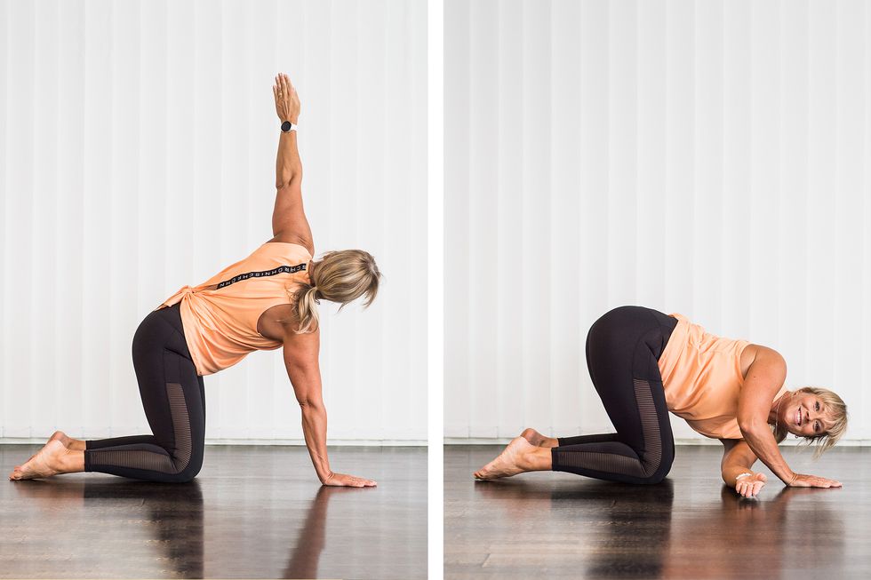 Lyft knäet, dra det åt sidan och rita en cirkel med knäet på sidan av kroppen. Ta stöd av en stol om du behöver. Gör rörelsen fem gånger och byt sedan till andra knäet. Om du vill utmana balansen och coremusklerna kan du prova att släppa stolen.