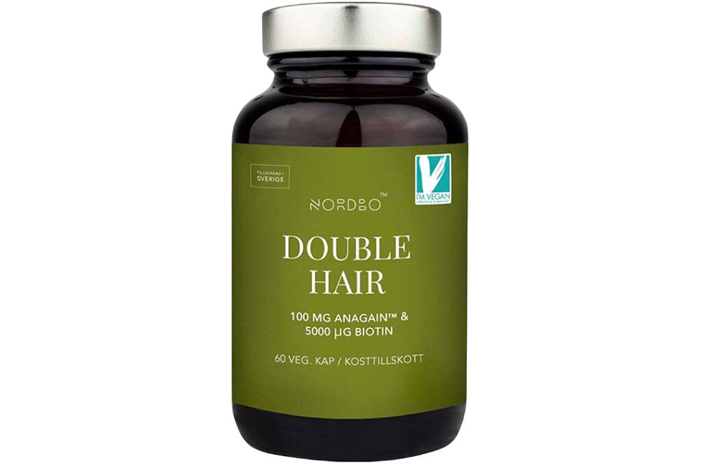 Nordbo Double Hair är ett kosttillskott som är speciellt framtaget för att motverka håravfall och stärka hårtillväxten. Double Hair innehåller AnaGain, som utvinns ur ekologiskt odlade ärtskott. AnaGain har i studier visat sig ge en markant förbättrad hårtillväxt genom att stimulera blodcirkulationen i hårsäckarna. Innehåller även biotin (vitamin B7) som medverkar i kroppens produktion av keratin, ett ämne som behövs för ett välmående hår.