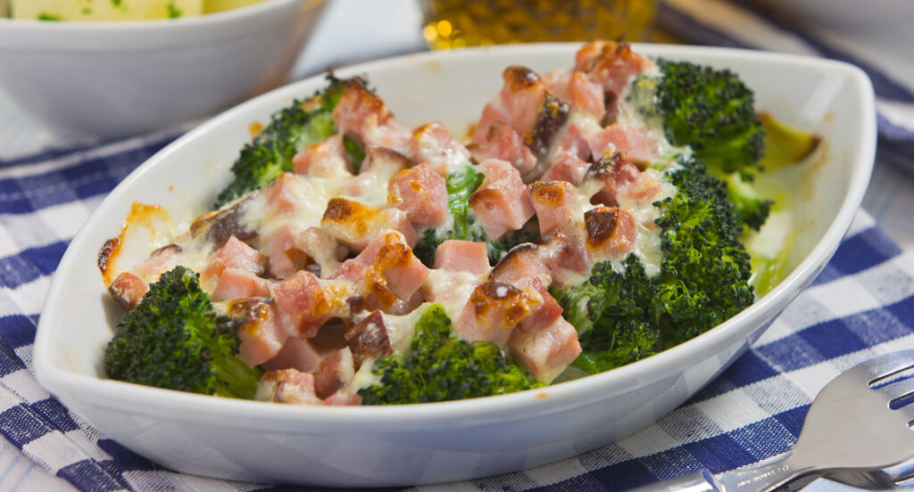 Skink- och ostsås: Tärna skinkan smått. Häll mjölken i en kastrull och vispa ut mjölet i mjölken. Koka upp under omrörning och låt sjuda i 3 mi-nuter. Tillsätt skinka och ost och låt osten smälta i såsen. Smaka av med salt och peppar.