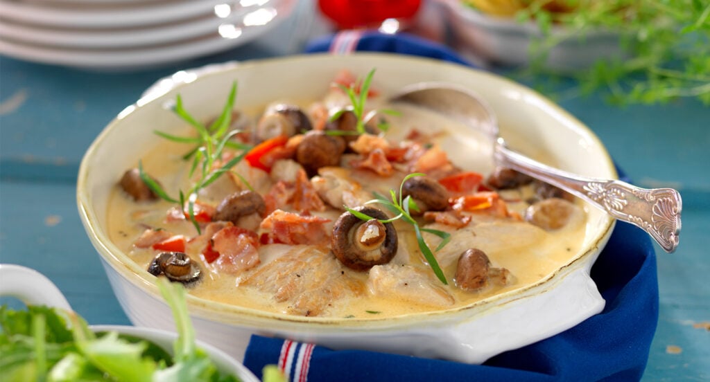 Lägg ner bacon, svamp, tärnade tomater och dragon i grytan, och smaka av med salt och peppar. Servera med klyftpotatis och sallad.