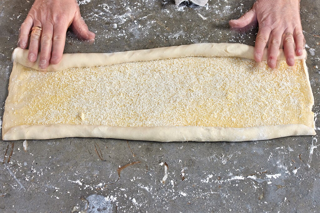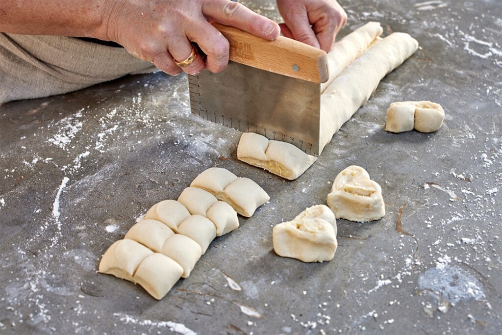 - Ta upp degen på mjölat bakbord och dela den i två bitar. Kavla ut varje bit till en platta på ca 55×35 cm. Bred på fyllning och strö över riven choklad. Rulla ihop degen från båda långsidorna tills rullarna möts på mitten. Skär i bitar rakt över (se bilder nedan).