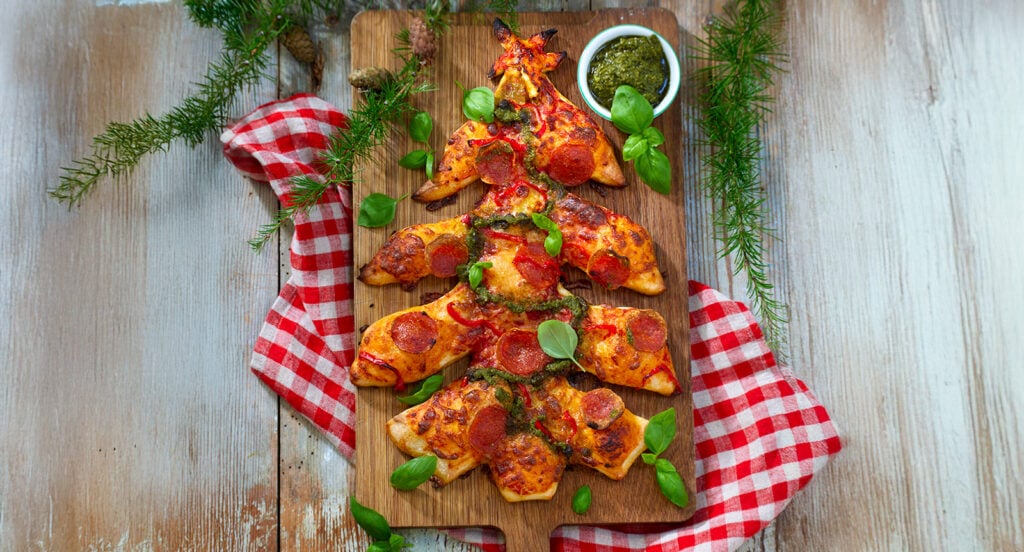 - Tryck ut pizzadegen till en trekant, lägg den på ett bakplåtspapper och skär bort deg så det blir grenar och fot. Gör en stjärna av degen som skärs bort och sätt på toppen.