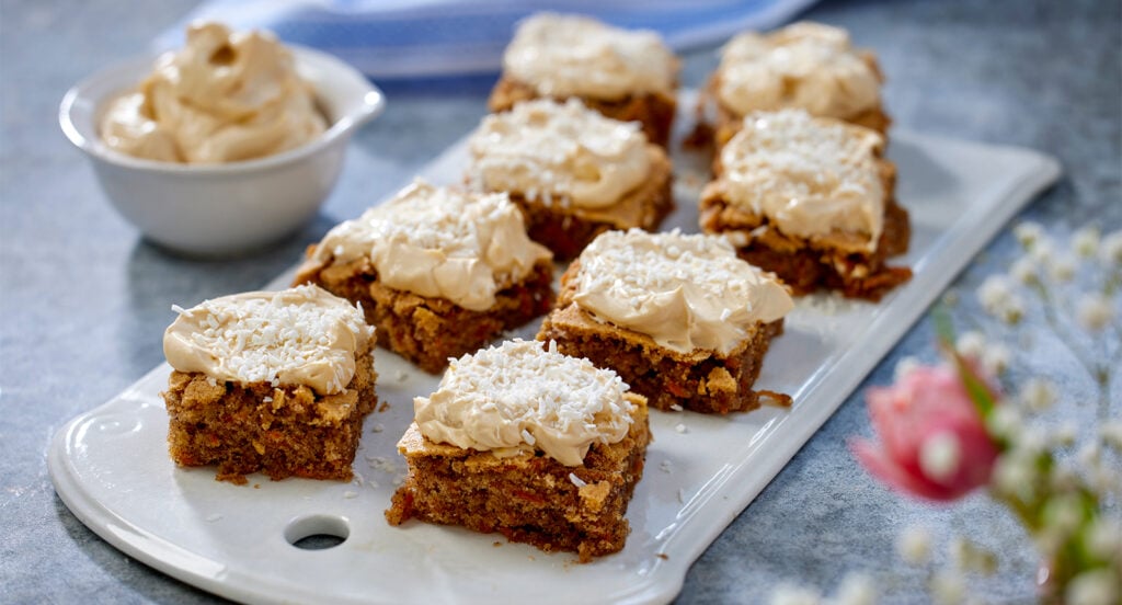 - Kolatopping: Vispa ihop karamelliserad mjölk, färskost och grädde och bred över bitarna. Strö över kokos.