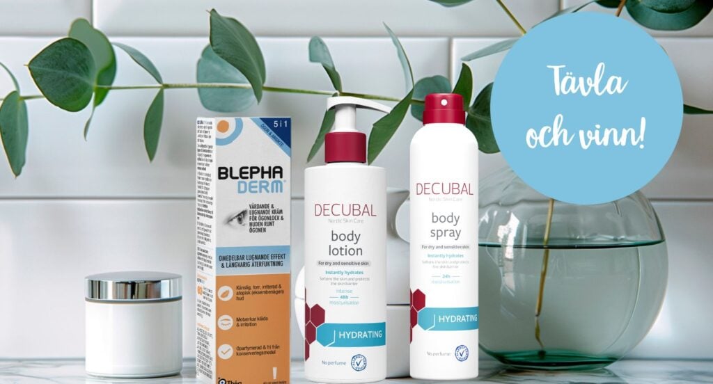 Svara på frågan nedan så är du med och tävlar om ett kit med fuktgivande hudlotion eller vårdande ögonkräm! Ange om du önskar hudvårdskit från Decubal eller ögonkräm från Blephaderm. Glöm inte att skriva din adress, ditt telefonnummer och din e-post! Namnet på den här tävlingen är HUDHÄLSA41.