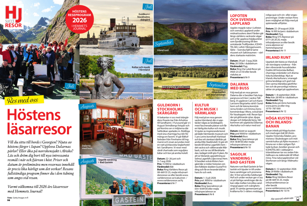 Under “Aktuella läsarresor” publicerar vi alla årets läsarresor i takt med att de kommer ut i tidningen. Är du här för att finna inspiration så hittar du vårt arkiv på tidigare resor längre ner på sidan. Där får du även möta några av resenärerna som medverkat på våra resor.