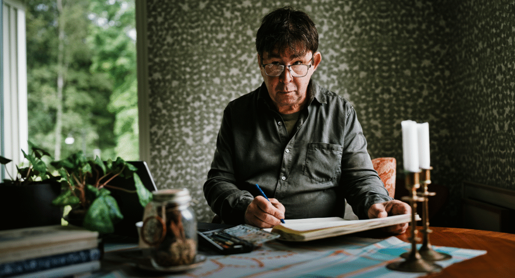Han bor vid en bäck utanför Gnesta och naturen har stått modell för både bilder och teckningar i Anders Mohlins kartotek.