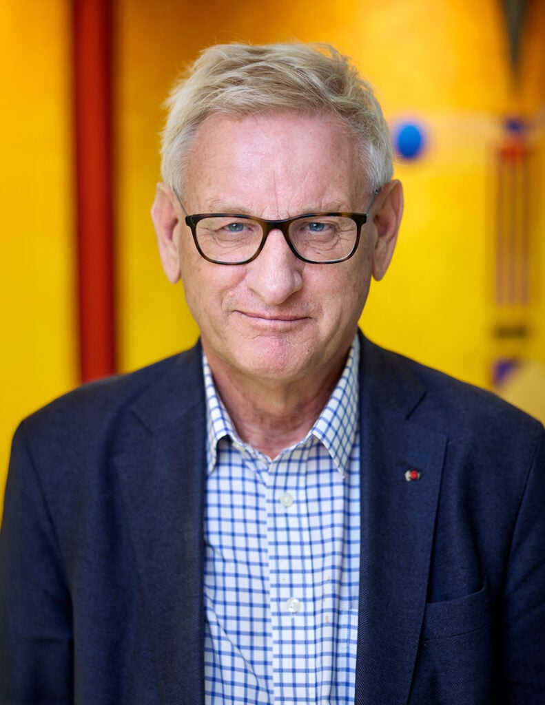 Bakgrund: Var partiledare för moderata samlingspartiet 1986-1999, statsminister 1991-1994, samt utrikesminister 2006-2014. Var EU:s sändebud på Balkan under 1990-talet, och har haft flera internationella uppdrag för FN, EU och Världsbanken.
