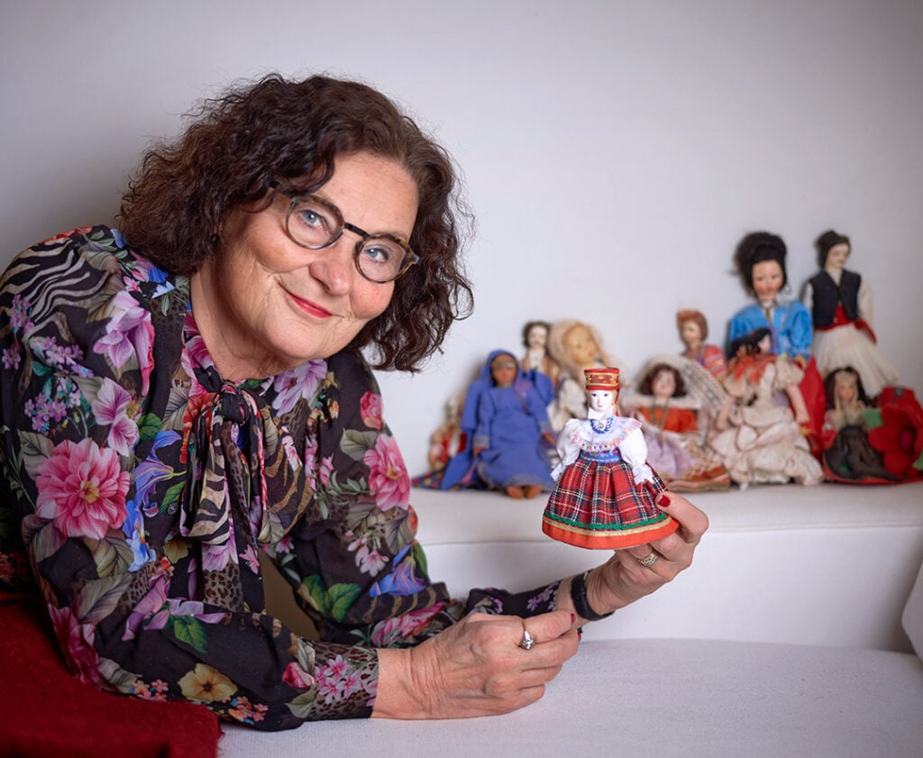Jag befinner mig i ett synnerligen trivsamt kulturhem. Här är bohemiskt, men samtidigt ordnat. Stor eldstad, böcker överallt, klassisk musik i högtalaren, ett piano, nallar och leksaker till barnbarnen… Och på ena soffkarmen i arbetsrummet: ett gäng dockor som står tätt ihop – sådana där som man köpte när man reste utomlands förr om åren. Det är ett kvinnokollektiv med ursprung i olika länder, och det ser ut som att de håller varandra i händerna.