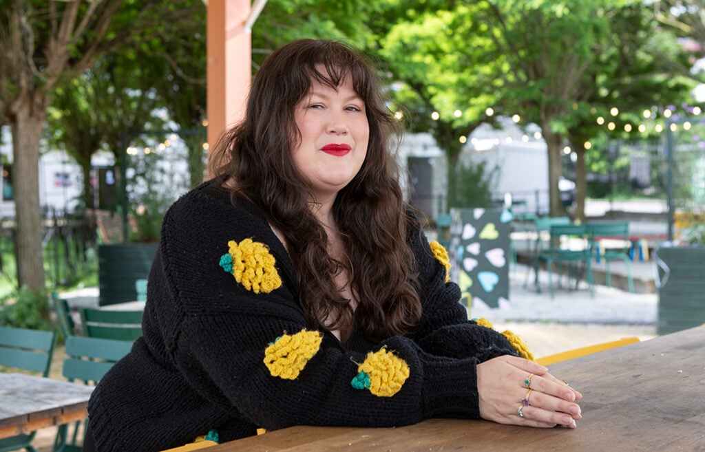 Vi ses i Malmö Folkets Park, en färgglad lekplats för små och stora Malmöbor. Maria är klädd i svart och bär en kofta med applikationer av virkade ananasar. Den saftiga frukten är något av hennes signatur och flimrar ibland förbi i hennes böcker. På sin hemsida poserar hon lojt liggande, balanserande en ananas på höften.
