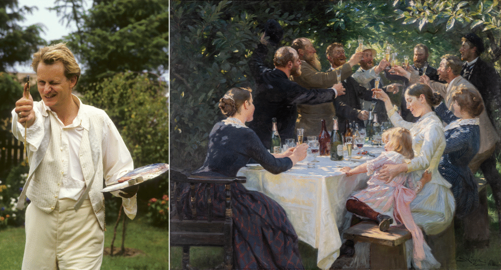 Filmtiteln är densamma som titeln på Kröyers mest kända konstverk; en glad och blöt trädgårdsfest, där konstnären själv står som nummer tre från vänster och skålar i champagne.
