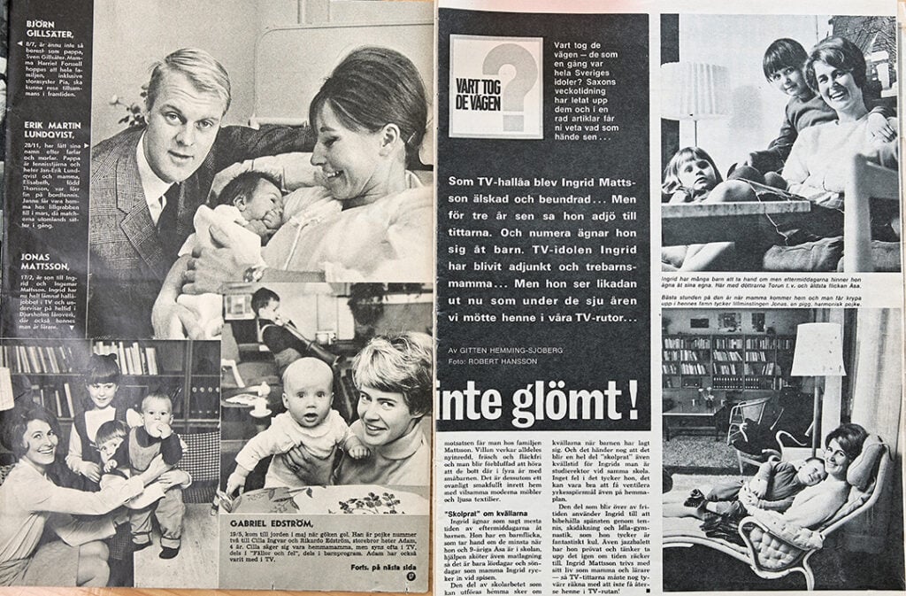 I en tid då alla tittade på samma kanal blev Ingrid och de andra hallåorna något av allmän egendom. När Ingrids första barn Åsa Mattsson, numera känd journalist, var liten prydde mor och dotter flera tidningsuppslag, vid enstaka tillfällen tillsammans med barnafadern Ingemar som hade tudelade känslor inför hustruns kändisskap.