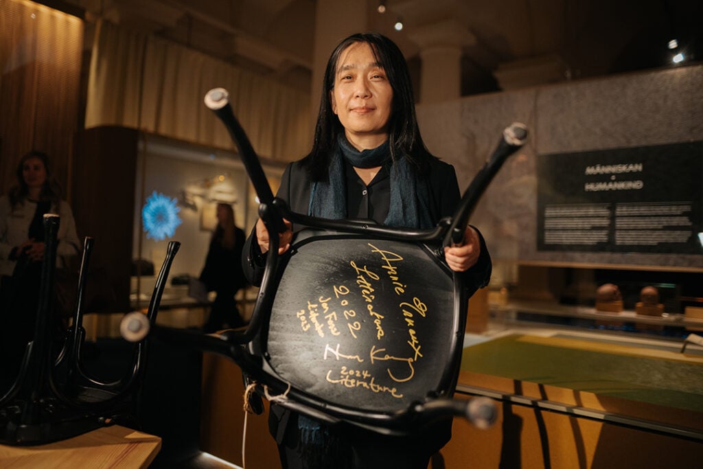 Inför det här reportaget har jag dessutom fått audiens hos Nobelstiftelsen, institutionen med det yttersta ansvaret för att förvalta Alfred Nobels testamente och säkerställa att Nobelpriset förblir troget sin grundidé. Pristagarna hälsar alltid på hos stiftelsen, vars lokaler ligger mitt emot Kungliga biblioteket, bland annat för att skriva sin signatur i en pampig, läderklädd bok. I den bok som används för tillfället har det skrivits autografer sedan 1952, och här syns både Bob Dylans och författaren Annie Ernauxs signaturer. Annie Ernaux bad för övrigt att få se sin landsmans – den tidigare pristagaren Albert Camus – namnteckning innan hon skrev sin egen.