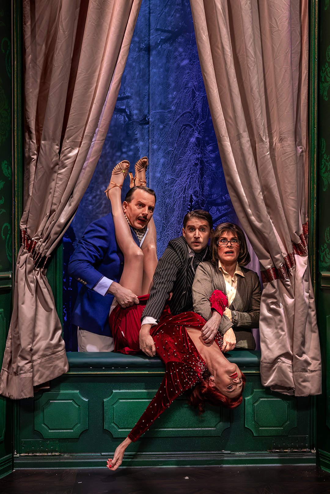 – Vi har så otroligt skoj och skrattar högt åt varandras repliker. Det här klassisk fars och bokstavligen väggar som rasar. Så det gäller att veta exakt vad man ska göra och var på scenen man ska stå – annars kan det gå riktigt illa.