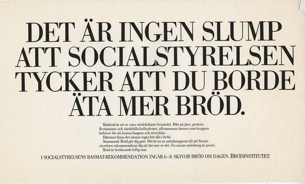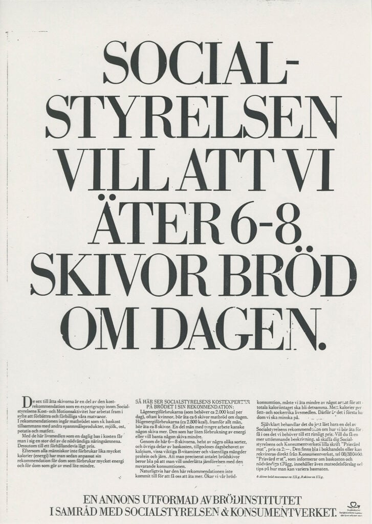 ”Socialstyrelsen vill att vi äter 6–8 skivor bröd om dagen” kom att bli en av de mest uppmärksammade reklamkampanjerna i Sverige genom tiderna. Den publicerades den 23 februari 1976 och anledningen till att den togs fram var att svenskarna, enligt Socialstyrelsens kostrekommendationer, behövde äta 25–40 procent mer spannmålsprodukter än de gjorde.