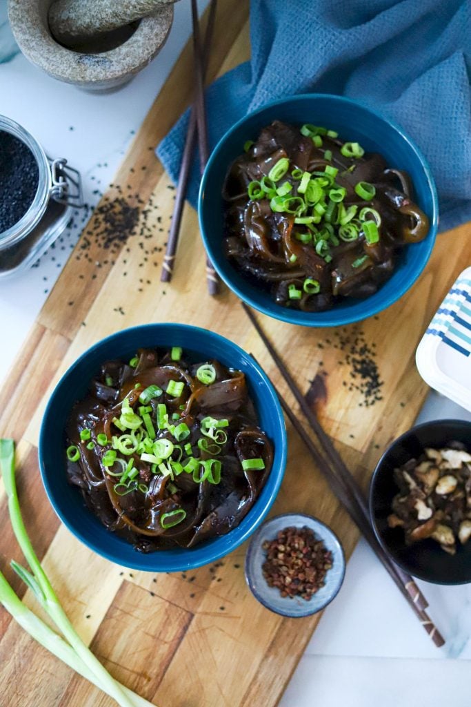 6. Hacka svamp och pak choi och fräs i en panna med Carlshamn Havssalt och koka sedan nudlarna efter instruktionerna på förpackningen.