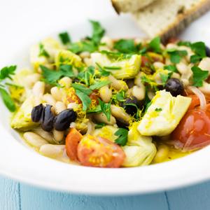 1. Mjukstek lök och vitlök i olivolja utan att det tar färg. Tillsätt bönor, kronärtskockshjärtan, tomater, oliver, buljong och vatten. Låt puttra försiktigt, smaka av med salt och peppar.