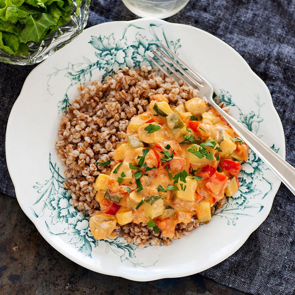 4 Servera grönsakspannan med pasta eller matkorn av något slag och en fräsch sallad.